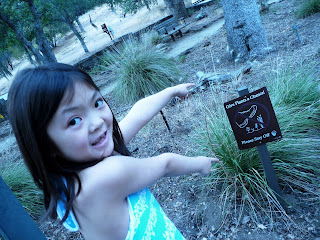 I tried to hug a young Sequoia at the Redwood trail. It was big but I saw a lot of young ones all over the place and I patted the top. Someday they will get so big I won't be able to touch their tops anymore. They got something sappy on to leaves of the young trees. The ponderosa pine, different from the sequoia, smelled like vanilla. It was yummy.
